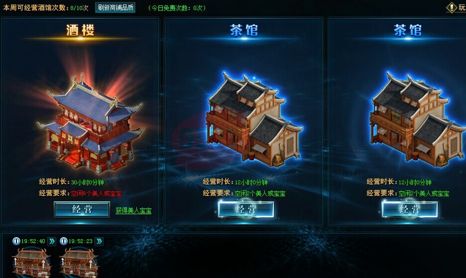 经营茶馆需要派遣2个美人或宝宝,经营时长为12小时,奖励极品攻击属性丹*6、极品防御属性丹*3、极品生命属性丹*6;