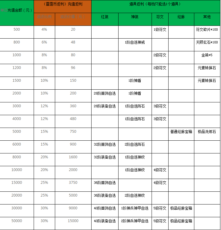 单日充值RMB 返利比例 应返奖励雷霆币 RMB