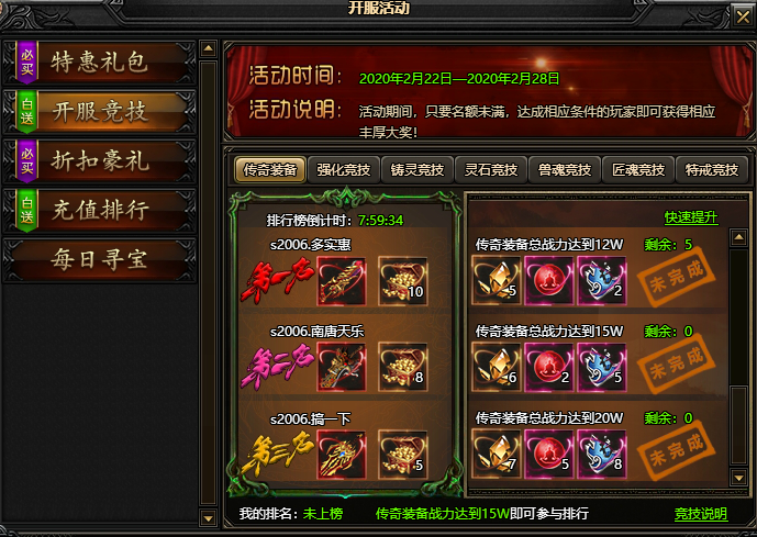 开服竞技上榜条件说明: