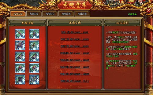 2.达到一定的战斗力方可进入龙魂包括,战力越高可进入的宝库层数越高,层数越高掉落越好。