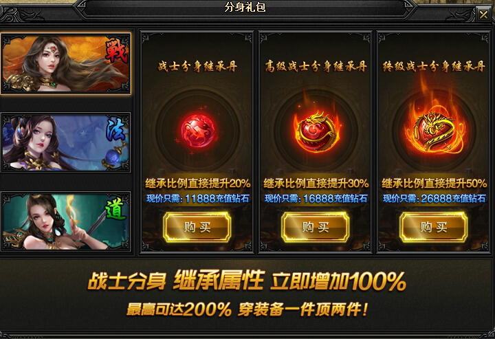 分身天赋:消耗天赋精华可升级英雄天赋,提升英雄的天赋等级可极大的增强英雄打boss的输出能力,天赋精华的获取途径为材料副本,活跃度奖励、商城购买等。