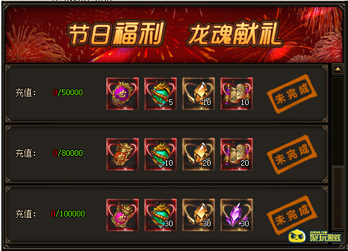 充值50000钻石:3品龙符、灵魂宝石*5、宝石碎片(大)*10、超级藏宝图*10