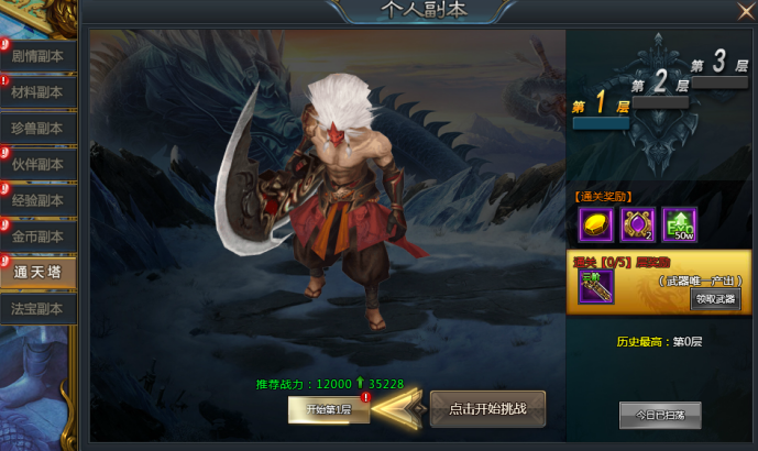 通天塔不仅产出各职业武器,还有大量经验!通关通天塔,可以让我们的战力迅速提高!通过之后,还可以一键扫荡至历史最高层,获得大量奖励!