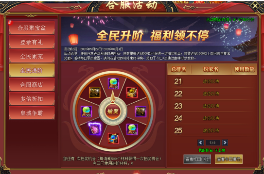 活动期间使用任意进阶系统的进阶石,总数量每达到500即可获得一次抽奖机会,数量达到1500以上即可参与排名奖励,活动每日零点重置,排名将在23:55结算,请勿在活动即将结束时冲榜,奖励通过邮件形式发放。