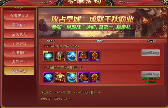 合服后所有服的皇城帮会将会重置,并在开服第二天晚上8点自动开启一轮皇城争霸,重新决出皇城城主,获胜方和参与者都可获得对应奖励。