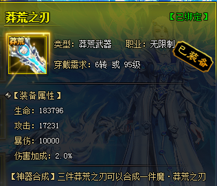 每三件莽荒装备可以合成一件魔·莽荒装备,每三件魔又可以合成一件圣,然后是神、天。终极的天·莽荒装备属性爆表,