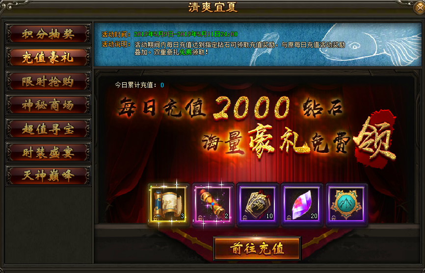 2.活动期间内,每日充值达指定钻石数额,即可领取充值奖励,可原每日充值奖励叠加领取。