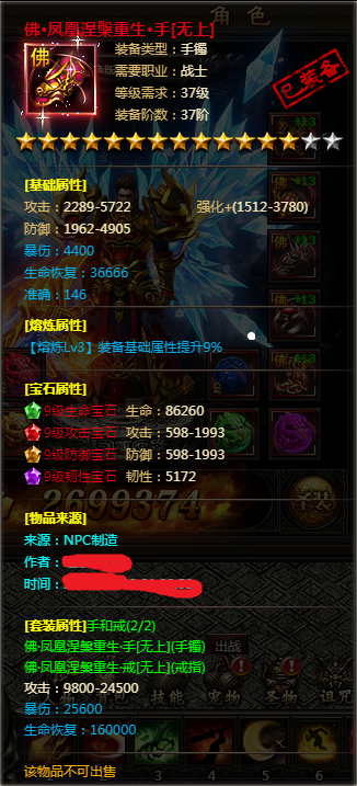 当服务器开启15天后就开启了装备的合成功能了,可以使用2个一样阶数的装备合成一件更好的装备,尊套。尊装备同样享有套装激活的属性,而且会更高。开服30天后就可以使用2件尊套合成一件“佛”装备,佛装备目前已经为合成到顶的装备了,不能在继续合成了。属性非常的强大,主要为生命恢复属性,可以极大的提高打怪的效率。