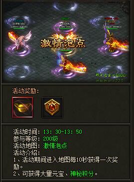在网页游戏灭神中,有一个每天仅有一次的激情泡点活动,时间为每天中午1点半到1点50,想要参加活动的玩家必须等级高于200级。