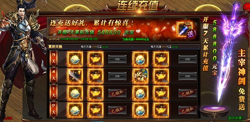 累计充值2天,每天充值1000元宝(高级转生丹*5 1000元宝),每天充值5000元宝(超级转生丹*5 3000元宝)