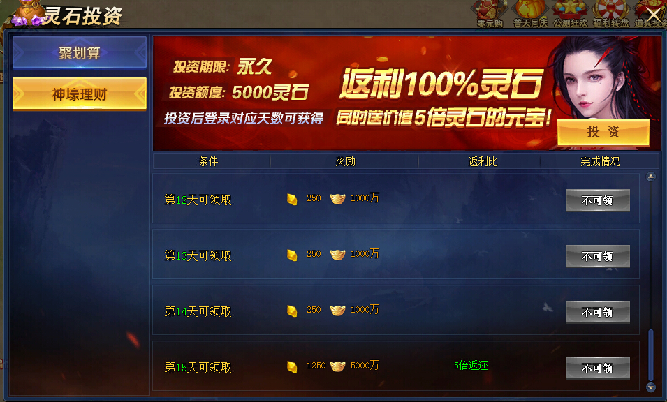 特玩网页游戏七战中,玩家在灵石投资界面可以进行投资,投资分为聚划算投资和神壕理财投资,投资后登陆对应天数即可领取大量奖励。全部奖励领取完成后,可以获得灵石100%返还,同时送价值5倍灵石的元宝。