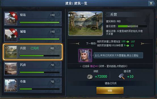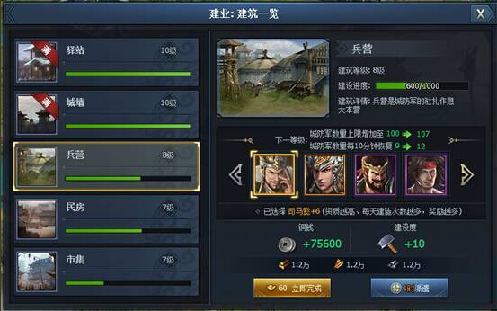 1. 选择需要建造的城池,打开建造界面派遣将领开始建造。