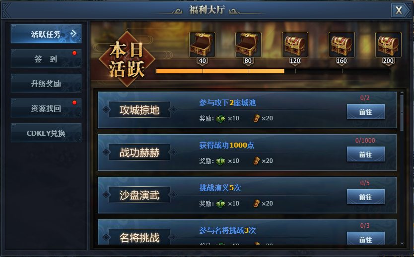 完成各项指定任务都可以获得活跃度和荣誉,当活跃度累积到一定数量,可以开启不同的宝箱。宝箱里含有大量的铜钱、刷新令、草料、军牌了,兵书等等