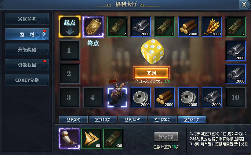 1)每天可以累计签到5次(在线获得次数)