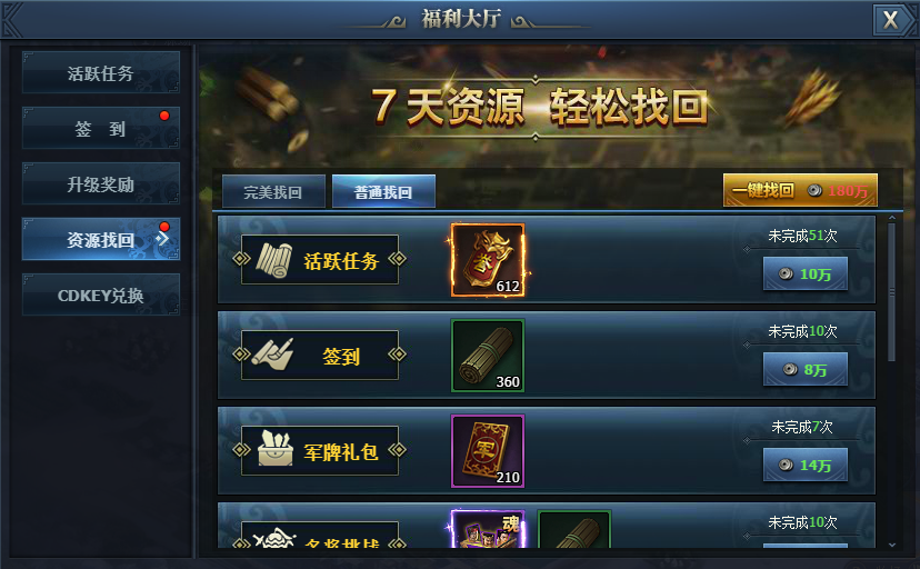 未完成的一些任务可以通过资源找回来挽救损失,既可以使用铜钱完成普通找回,也可以使用元宝来完美找回