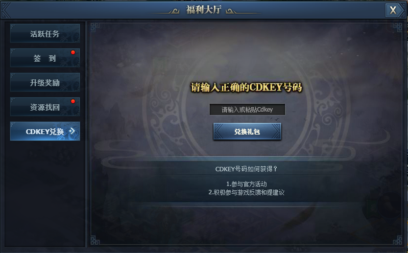 参与官方活动或者积极参与游戏反馈和提建议都可以获取CDKEY兑换码,输入CDKEY号码即可兑换礼包,礼包里含有大量的日常资源.