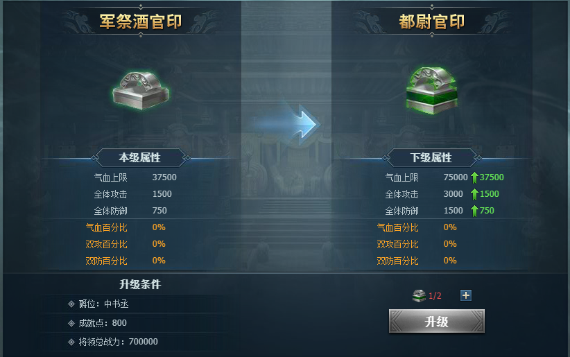 提升官印等级需要使用相应的激活材料,如:激活军祭酒官印的材料为都尉印记x1,此物品可在开服3天后拍卖物品中获得,获得特定数量并点亮升级按钮即可获得当前级别的官印,并获得气血上限、物理攻击、法术攻击、物理防御、法术防御在内的5大属性加成,使主公战力更上一层楼!