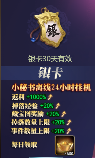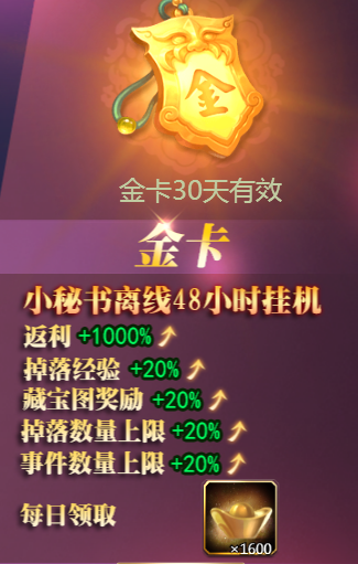和银卡不同的是,开通金卡之后,每天可以领取1600元宝,30天一共可以领取48000元宝,元宝作为游戏中的通用货币,用处十分广泛,可以招募武将、参与抽奖等等。因此小小编觉得金卡的性价比更高一点,开通金卡会更划算。