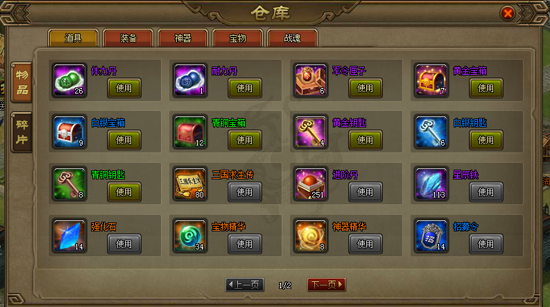2. 物品形态中共分五大类物品,分别为:道具、装备、神器、宝物、战魂。