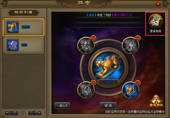 1、玩家在获得一个宝物碎片后,即可利用夺宝合系统通过夺宝夺取其他玩家宝物碎片合成整个宝物