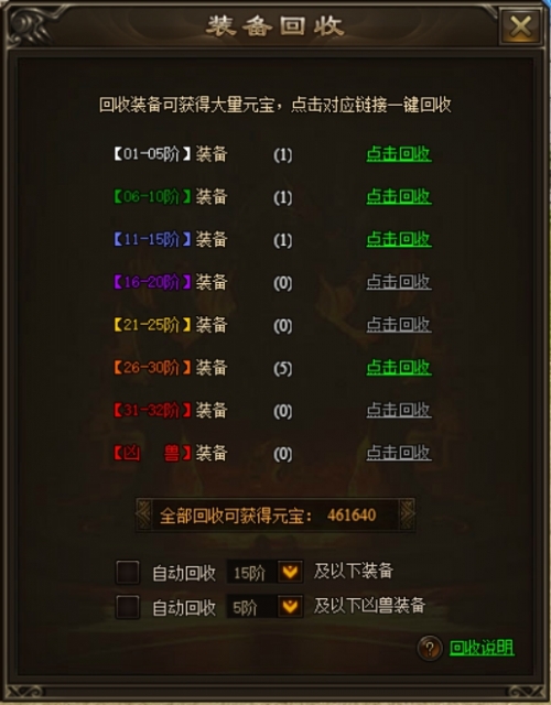 《神戒》装备回收通过角色背包的装备回收按钮打开,可以回收玩家不需要的装备,装备回收可获得大量元宝。装备回收的元宝根据装备的等级决定。