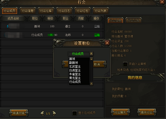 可查看当前申请加入行会的人员列表。行长和副行长可同意或拒绝申请。可进行申请攻城、行会聊天。行会的繁荣需要所有行会成员共同努力。维护行会设施需要消耗行会资金,行会规模越大,维护费用越高。行会资金到达一定数量便可消耗资金升级行会等级,行会最高为8级,行会等级越高,容纳的人数越少,成员增加的属性就越高。行会仓库的物品,可以互换装备。双击或者拖拉进行兑换,提取行会仓库的装备,需消耗贡献值,存入装备,可以获得贡献值。行会事件:查看行会发生的事件。