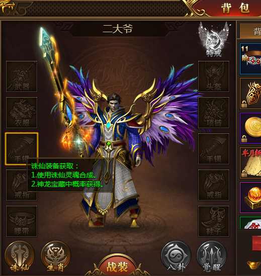 首先,盛世遮天里的装备分为战装和神装,战装则是大家常见的普通装备,这些装备直接刷怪、打BOSS等,都比较容易获得的;而神装则是比较难得获得的一类高阶装备。游戏里的神装有诛仙装备、圣域装备、炼魂装备3种类型的。