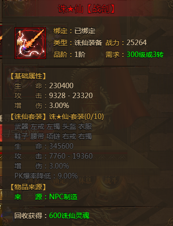 玩家可以利用诛仙灵魂,对诛仙装备进行升阶,来提升诛仙装备的属性效果。玩家佩戴各种诛仙装备,可获得一些攻击、防御的属性。当玩家身上佩戴齐指定件数的诛仙装备,还能激活套装效果活动生命、攻击、增伤、PK爆率降低的套装属性。