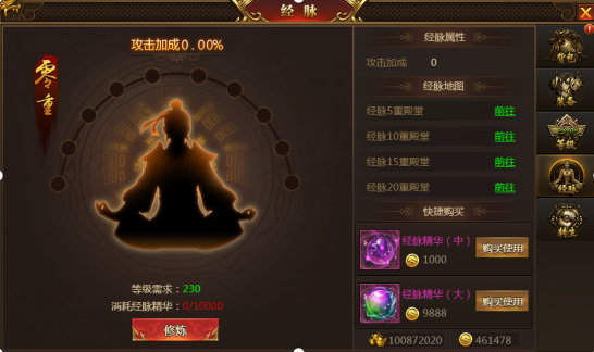 1.修炼经脉需要消耗经脉精华,经脉精华可通过降妖任务或者直接商店购买获取