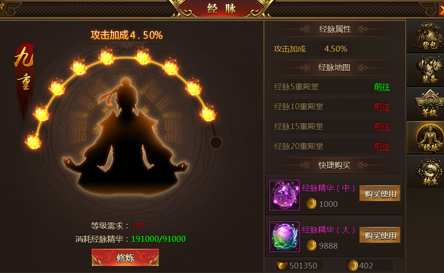 4.经脉共有五十重,每提升1重都会获得属性提升