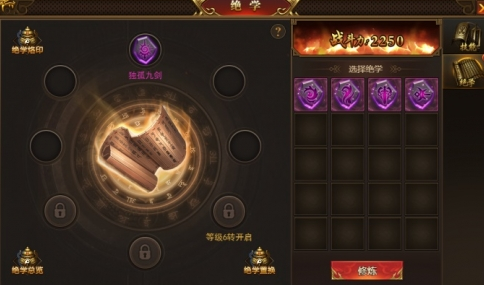 当玩家等级达到200级时,就可以解锁绝学系统的玩法。特玩《盛世遮天》共有12种绝学,而每种绝学分为中级和高级2种。绝学种类分别是九阳神功、独孤九剑、金刚不坏、六脉神剑、斗转星移、北冥神功、九阴真经、小无相功、龙象般若、天外飞仙、易经洗髓、凌波微步。可增加角色生命、攻击、防御、暴击、伤害降低、回复等各类属性。绝学可以通过击杀高级BOSS、参与日常活动获取。