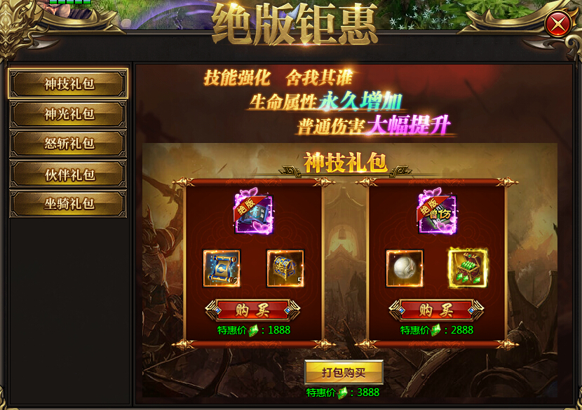 特玩网页游戏神王中,玩家通过购买各种钜惠礼包,可以大幅度提技能、神光、伙伴等属性。