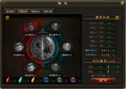 1. 同时将石化、赤焰、紫电器灵等级提升至5/10/15/…/40。可触发“魔灵共鸣”,魔灵共鸣提供特殊属性“人物麻痹几率”加成。无需佩戴妖器即可生效。