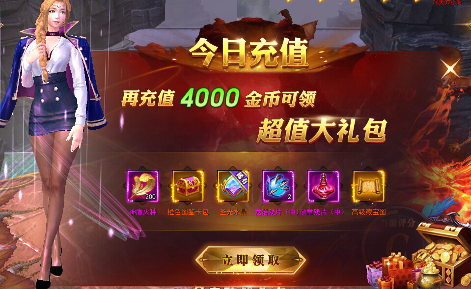 今日充值5000金币:神鹰火种*200、橙色图鉴卡包、圣光水晶、龙语残片(中)*2、徽章残片(中)、高级藏宝图