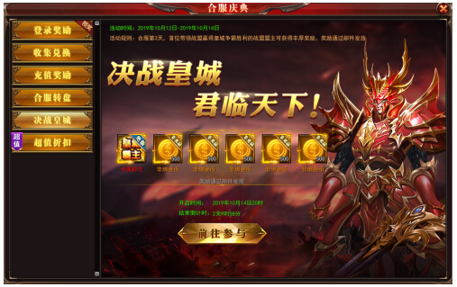 【活动内容】合服开服后第3天,首位带领战盟赢得皇城争霸胜利的战盟盟主可获得丰厚奖励,奖励通过邮件发放