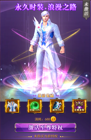 至尊特权:玩家需要消耗388金币进行激活,激活后即可领取永久时装“浪漫之路”,经验+30%、减伤20%、至尊首领准入特权。