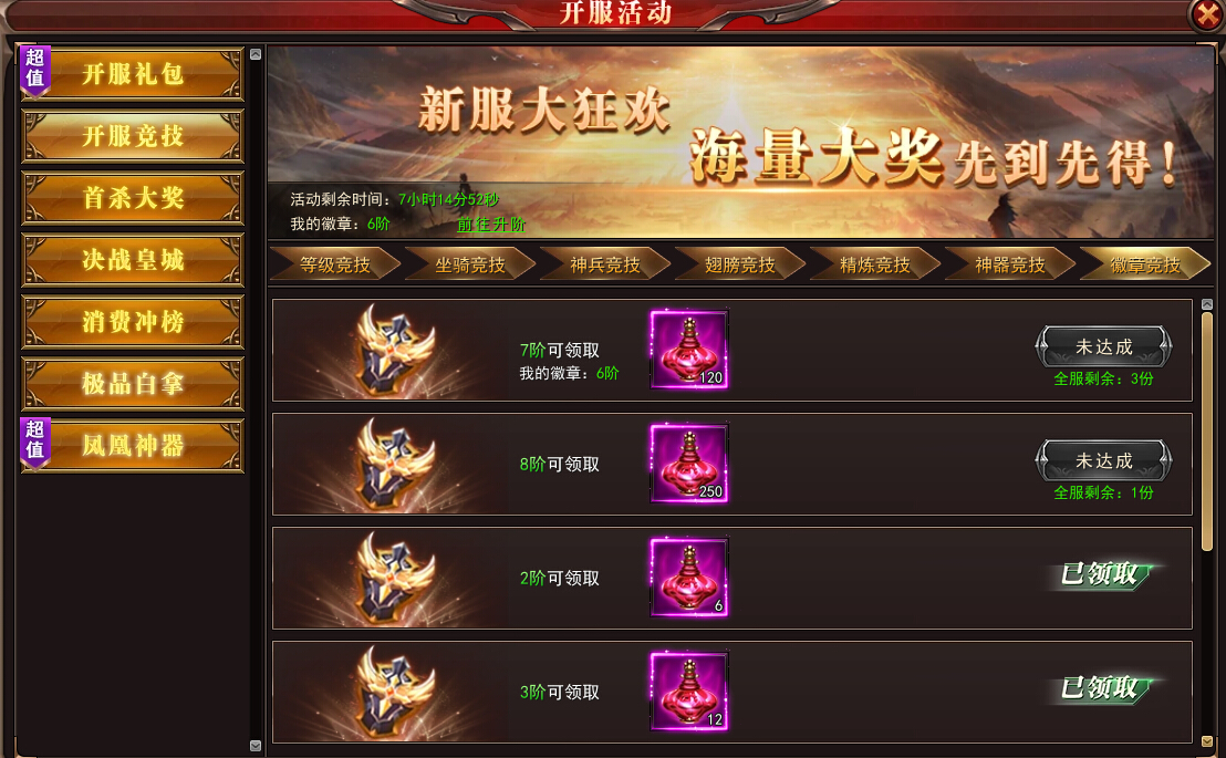 剩下的几个竞技完成就有点难度了,玩家额外花费一定的钻石了,其中翅膀竞技有一部分运气,玩家额外花费几千金币即可完成,这个活动建议玩家游戏花费金币完成。之后比较好完成的就是神器竞技了,玩家可以购买第六日的玛雅宝盒第三个不限购的,购买大约10次左右即可完成了,大约1-2w金币。精炼竞技玩家在开启精炼副本后,建议玩家每日增加10次额外次数,然后自身在商城中购买一部分精炼石也可以完成了,大约需要2w左右的金币,最后的一个徽章金币玩家想要拿到最后一个档次的奖励的话,需要花费非常多的金币,建议玩家完成7阶奖励即可,最后一档的奖励也不是非常的好,小编预计的话需要几十万的金币了。