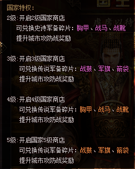 国家商店等级越高,可购买到更多类型、更高品质的军备。
