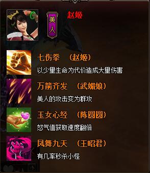 美人挂机升级技能搭配挂机打怪升级最重要的就是效率了,所以本来首推应该是有着群攻技能的武媚娘了,但因为武媚娘品阶实在过低,只是蓝色等阶,所以我们就只能选用一个高等阶的美人再纳用武媚娘的万箭齐发技能。所以我首推的是有着七伤拳的赵姬!赵姬的获取有些麻烦,需要玩家册封秀女或者翻牌时才能产出,但产出后绝对物有所值。如果没有也可以先选用王昭君替代一二。