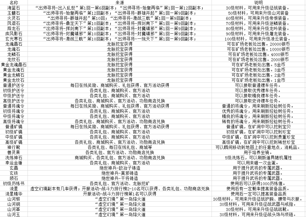 《新斗将魂》游戏内各类材料及道具来源和使用说明: