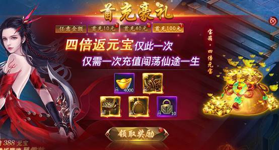 首充100元可获得三件橙色坐骑装备,以及4000绑元!帮助您第一天坐骑冲榜。