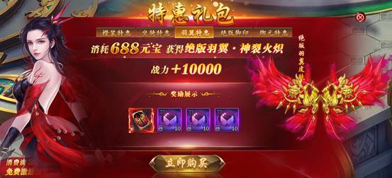 花费688元宝可获得绝版“神裂火炽”羽翼皮肤一个,不一样的外观让您与众不同。