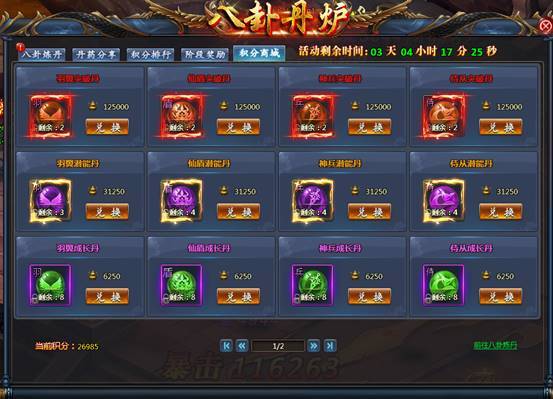 活动在开服第二天开启,玩家通过消耗元宝炼制丹药可获得炼药积分,分享给全服玩家被玩家领取之后可获得额外积分。