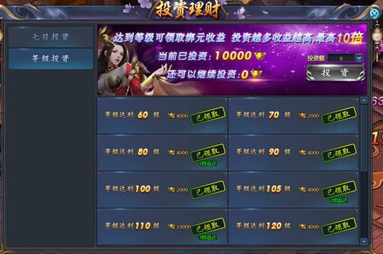 绝对是前期冲榜必备之选,七日投资以及等级投资直接10倍绑元返还,让你在开服冲榜期间敞开了升阶。