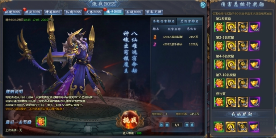 奖励发放规则同精英boss,分为单场排名奖励以及总伤害排行榜奖励