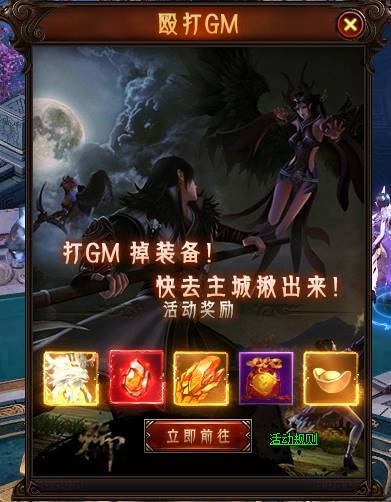 殴打GM活动是阴阳道的特色活动之一,每天天都城中都会刷新数只GM提供给玩家挑战,GM携带着大量的材料奖励和永久坐骑时装、玩家击杀后即可通过抽奖获得