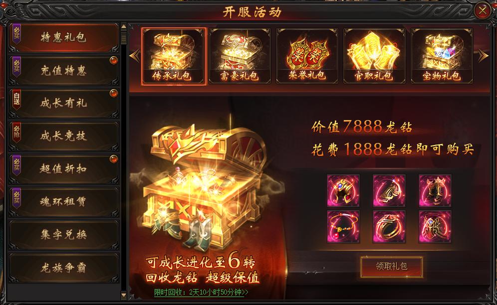 说明:开服第一天即可购买。包含六件传承装备,低等级穿戴限制与高属性,让您PK打宝更爽快!传承装备更是成长型装备,最高可进化至6转!(进阶至6后更可回收成龙钻,超级保值!)
