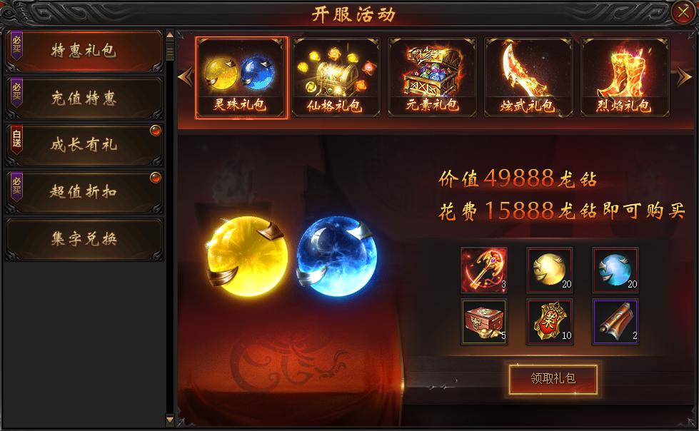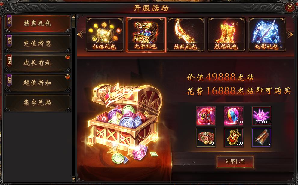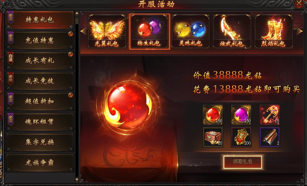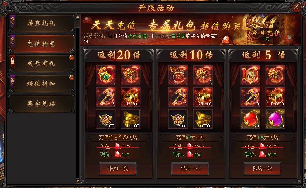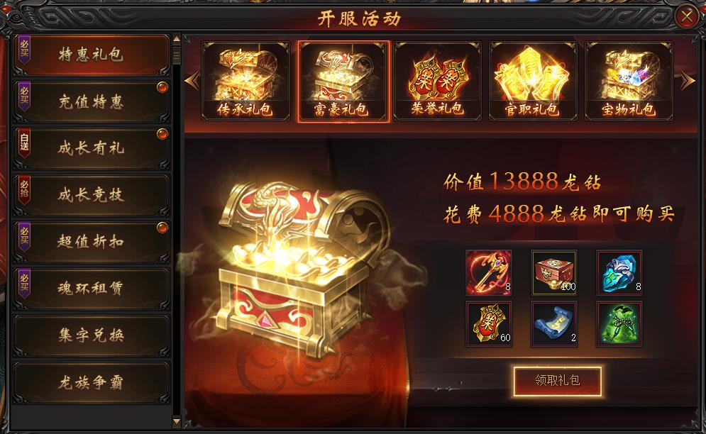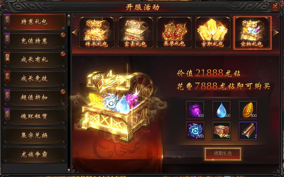 说明:开服特惠礼包,随开服天数逐步开放,终身只可购买一次!各种稀有珍品助您称霸战龙!
