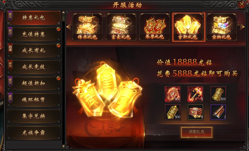 说明:开服第二天即可购买。购买礼包即可获得官职大礼包,高人一等,PK威慑对手,刀刀附加额外伤害!