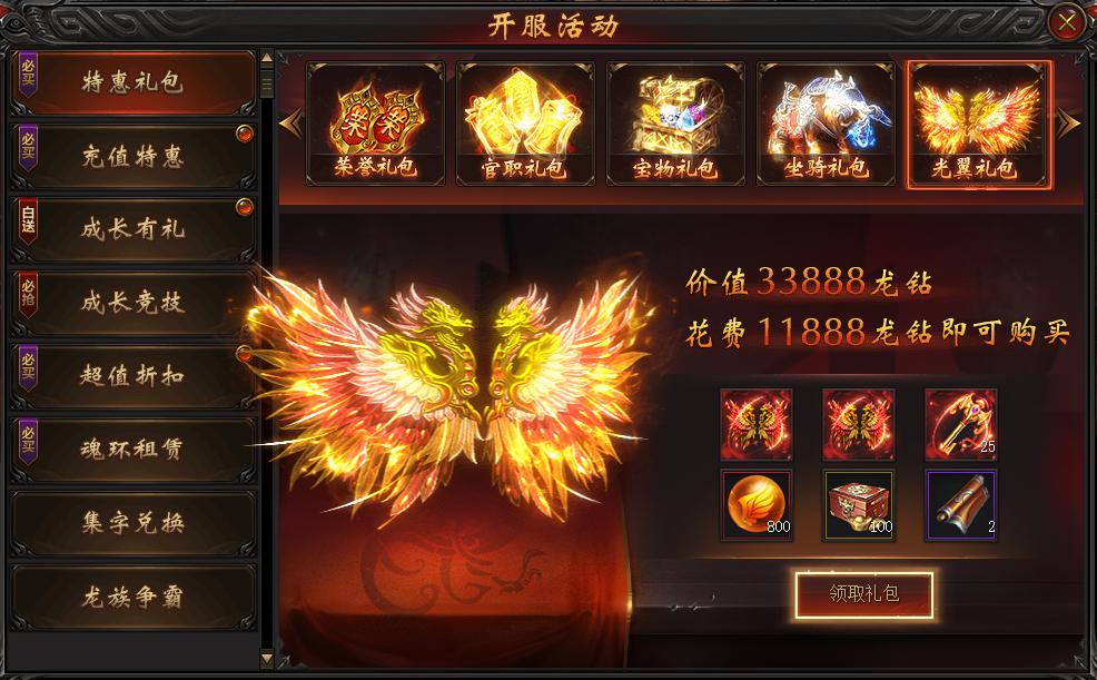 说明:开服第三天即可购买。购买礼包可得两个炫酷光翼及大量光翼升阶材料,实乃提升光翼必备之良品!